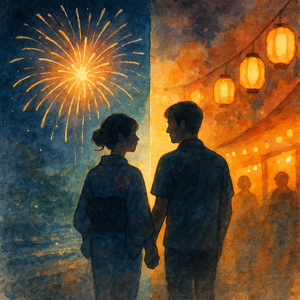 エンド: 花火が夜空を彩った後の帰り道、ちょっとひんやりした夜風に当たりながら、彼がそっと手を握って「来年も絶対一緒に行こう。ずっと続けたいね」と囁いてくれた瞬間。花火の余韻と彼の温かい言葉が胸に響いて、思わず笑顔になっちゃっう瞬間。